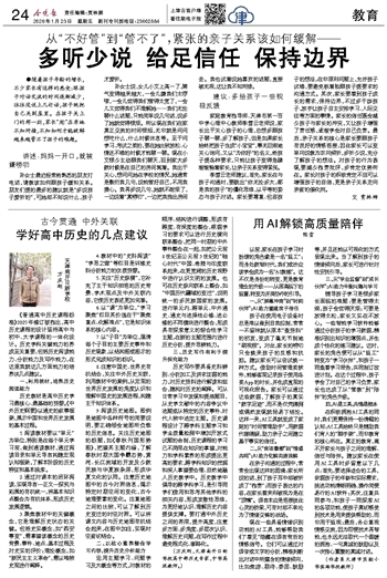 李雪云老师建议,首先,家长在与孩子沟通时,要跳出“你无论多大,都是我的孩子”的僵化思维,以平等的姿态与孩子对话。家长要尊重、包容孩子的想法,在非原则问题上,允许孩子试错,要避免板着脸跟孩子提要求的沟通方式。其次,家长要看到孩子成长的需求,保持边界,不过多干涉孩子,放手让孩子自主安排学习、人际交往等方面的事情。家长的信任既会减少孩子与家长的冲突,又让孩子增强了责任感,逐渐学会对自己负责。最后,亲子关系的核心是家长要跟孩子有良好的情感连接,因此家长可以变单向说教为双向倾听,多听少说,充分了解孩子的想法。对孩子的行为表现,要减少指责批评,多肯定优势所在。家长对孩子的积极肯定不但可以增强孩子的自信,更是亲子关系走向亲密的催化剂。
