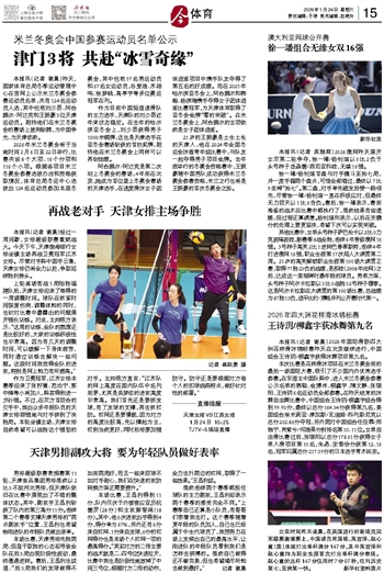 本报讯(记者 谢晨)昨天,国家体育总局冬季运动管理中心在官网上公示米兰冬奥会参赛运动员名单,共有124名运动员入选,其中包括刘少昂、阿合娜尔·阿达克和王振豪3位天津运动员。期待他们在米兰冬奥会的赛场上披荆斩棘,为中国争光、为天津添彩。