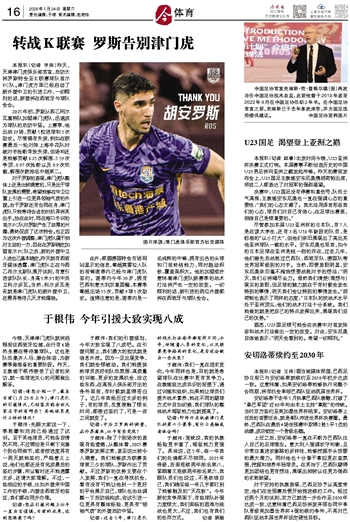 本报讯(记者 申炜)昨天,天津津门虎俱乐部官宣,后防大将罗斯转会至K联赛球队首尔FC队。津门虎方面已经启动了新外援中卫的引进工作,一切顺利的话,新援将在西班牙与球队会合。