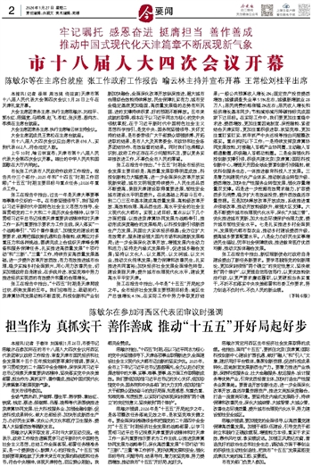 本报讯(记者 于春沣 刘国栋)1月26日,市委书记陈敏尔在参加所在的市十八届人大四次会议河西区代表团审议政府工作报告、审查天津市国民经济和社会发展第十五个五年规划纲要草案时强调,要深入学习贯彻党的二十届四中全会精神,深学深用习近平总书记视察天津重要讲话精神,坚决落实党中央决策部署,担当作为、真抓实干、善作善成,推动中国式现代化天津篇章不断展现新气象。