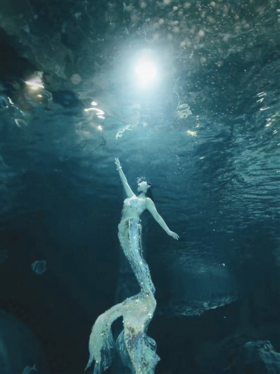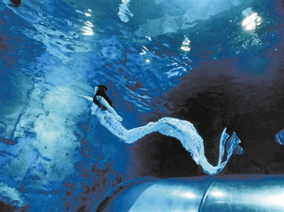 在陆地上学习了一段时间后,已经基本掌握技能的傅洁,开始进入水下实践环节。在海洋馆里,她穿上美人鱼的服装,和各种各样的海底生物一起游泳,那个场景,让她至今难以忘怀。