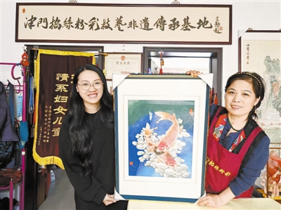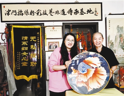 的确,傅洁不仅学得快,还能把自己的思想融入作品中。她说,学到中级班的时候,有一幅作品是“金龙鱼”,当时其他人做的都是红色的,但她自小喜欢蓝色,就想做一条蓝色的鱼。最终,傅洁得到了师傅的允许,做了一条蓝色的“金龙鱼”,没想到,这与众不同的小创意获得了十分不俗的艺术效果。