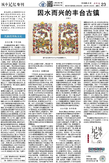 除去汇聚的五条河流外,在丰台古城护城河的四周曾经还开凿有数十条大水沟与之相连,一直通到镇外。在清乾隆二十年《丰润县志》中记有明代冯珍写的一首名为《丰台》的诗文,内容是“水国秋偏早,开帘暑气无。湖平见远树,夜静觉飞凫。帆影悬新月,潮声击败蒲。十年江海别,风景亦南隃。”诗中用水国、湖平、飞凫、帆影、潮声、江海等大量文字描述了丰台镇水系的发达。笔者在一本1962年出版的《河北美术》中一篇介绍东丰台木版年画的文章中,还发现了丰台镇有着“小扬州”的别称。