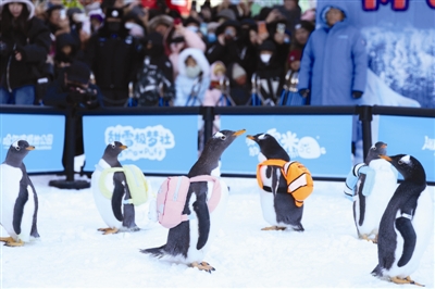 近日,来自哈尔滨极地公园的“淘学企鹅”来到了“林都”——黑龙江省伊春市巡游,吸引众多市民和游客前来观赏。新华社发 (李佳星 摄)