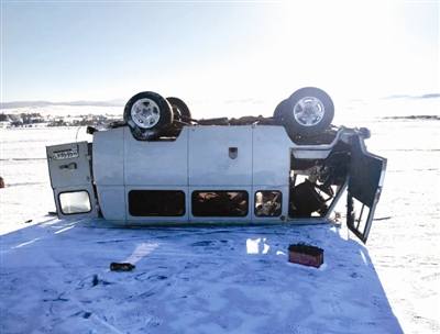 一辆载有游客的汽车1月28日在俄罗斯贝加尔湖冰面上翻车,导致一名中国籍游客死亡。 新华社发(俄罗斯伊尔库茨克州内务总局供图)