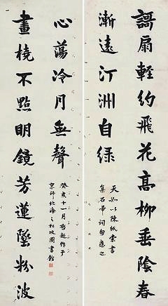 梁氏的其他集联非专门针对某人而作,他录出后给亲朋好友选择,选定了便写就送之。其中一副全集姜白石语,为刘崧生挑出:“忽相思(《红梅引》),更添了几声啼鴂(《琵琶仙》);屡回顾(《法曲献仙音》),最可惜一片江山(《八归》)。”林宰平挑的一副是:“酒酣鼻息如雷(刘后村《沁园春》),叠鼓清笳(周草窗《高阳台》),迤逦度沙漠(姜白石《凄凉犯》);万里夕阳垂地(朱希真)《相见欢》),落花飞絮(秦少游《如梦令》),随意绕天涯(赵令畤《乌夜啼》)。”胡适也挑了一副:“蝴蝶儿,晚春时(张泌《蝴蝶儿》),又是一般闲暇(辛稼轩《丑奴儿近》);梧桐树,三更雨(温飞卿《更漏子》),不知多少秋声(张玉田《清平乐》)。”此联如小令,又明白如语,正是胡适一度尝试的风格,难怪他挑中此副。