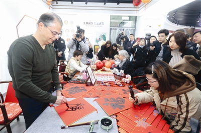 鲁班工坊体验馆内的榫卯作品,一榫一卯,不借一钉一铆,却能稳如磐石,引得使节及嘉宾连连赞叹。在福字展桌前,希腊驻华大使卡尔佩里斯饶有兴致地挥毫泼墨,亲手写下“福”字,并当场赠予学院。