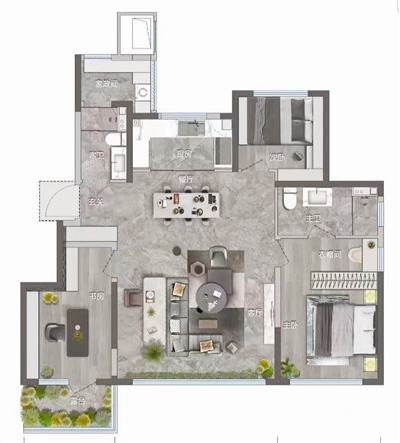 约112平方米三室,约9.7平方米的阳台,尽享阳光书房或是满目充盈的花房空间,满足了对生活闲情的需求,主卧的飘窗设计并不只是年轻人的专属,约1.53平方米的专属空间,让心情得以舒缓沉静,而约4.68平方米的花园露台,一张圆桌一把座椅,阵阵香茗飘来,观赏四季风景。