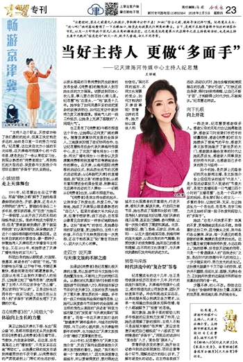 2023年初,纪思慧作为“天津文旅推介官”,开启了面向全国游客推介天津文旅资源的重任。她说:“我不能只做一个‘拿话筒的人’,因为我深爱着这座城市,所以要做得更好,要对得起这份信任。”面对不同的城市、不同文化背景的受众,如何才能讲好天津故事呢?带着这样的思考,她开始以媒体人和城市文化观察者的双重眼光,行走天津,感知天津,解读天津。行走四方做节目,她也养成了观察和比较的习惯,思考别人家的城市好在哪,咱们天津的魂又在哪,甚至自己撰稿、参与剪辑,让每一次推介都有了厚度和真诚。北京、雄安新区、澳门、香港、石家庄、济南、洛阳……从五大道的海棠花巷,到海河畔的流光溢彩,从西北角的热气腾腾,到煎饼馃子的街角酥香,她用自己的感受和理解,在不同的文化语境下,为天津找到最能引发共鸣的讲述方式。
