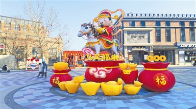 近日,本市河东区棉3创意街区搭建起3组迎新春景观,并在街区入口处悬挂起灯笼,将街区装点得红红火火。 记者 周伟