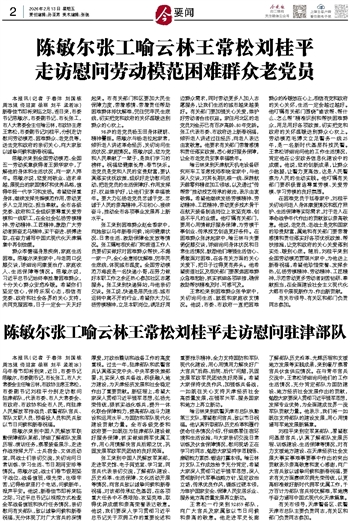 本报讯(记者 于春沣 刘国栋 周志强 佟迎宾 徐丽 刘平 孟若冰)马年春节即将到来,近日,市委书记陈敏尔,市委副书记、市长张工,市人大常委会主任喻云林,市政协主席王常松,市委副书记刘桂平分别走访慰问驻津部队,代表市委、市人大常委会、市政府、市政协和全市人民,向驻津人民解放军指战员、武警部队官兵、军队文职人员、预备役人员和民兵致以节日问候和新春祝福。