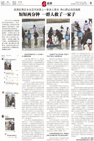 2月3日,本报报道了武清区黄庄乡永定河冰面上,一家三口意外落水,多位热心市民挺身相救的新闻。昨天下午,此事迎来暖心后续,救人者张磊、崔立松收到见义勇为证书,见义勇为行为被正式确认。