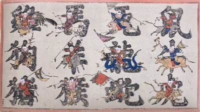 在莫斯科国立东方民族艺术博物馆,NO.2244.1藏品为清末杨柳青年画《十二生肖》,印制画店“天津会顺成”署于画角。画面依当年由右至左竖写习惯,排列鼠牛虎兔龙蛇马羊猴鸡狗猪十二个大字,用这些装饰着花纹的正楷为衬景,描绘孩童各以属相动物为坐骑,或耍枪挥剑,或舞动旗帜,形同年画《婴戏图》的戏出造型,飒爽英姿,各个威武,彰显出勃发活力与童趣,表达对十二生肖的想象,对生命的礼赞。在同类题材中,这是一幅颇见特点的作品。