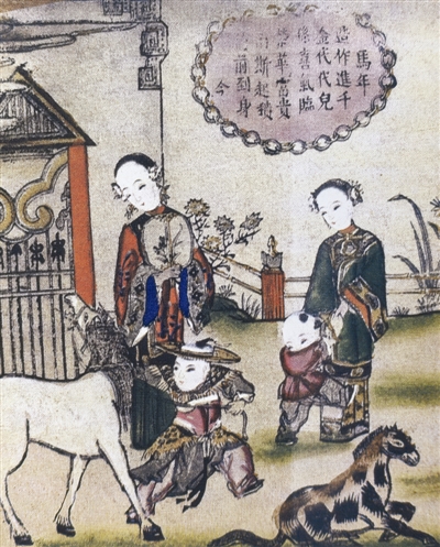 “马年造作进千金,代代儿孙喜气临”,清代杨柳青年画题画诗。这是一组四屏条,每条三幅,计12个画面,分别绘仕女儿童与景物,每幅绘一种生肖,并附吉语诗。如,“鼠年造作主荣昌,此物居头定永康,以后时和兼岁好,六亲丰足更坚强”,画面为仕女娃娃观看驯鼠蹬轮。这是子鼠。丑牛那幅,一娃骑牛,一娃牵缰,牛犊相随,仕女凭栏,题诗“牛年造作置田园,万顷春耕事益繁,四海农夫歌大有,荣华富贵自迎门”。年支逢寅称虎年,画的是可以亲近的山君,斑斓庞然而友善,二娃戏之,一个手持佛手柑枝,一个手举葫芦,仕女悠闲旁观。画面题诗:“虎年造作得高升,富贵荣华福寿增,生意家家皆有道,招财进宝勃然兴。”