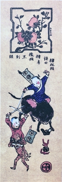 清代杨柳青又曾印行《十二属相图》,圣彼得堡国立艾尔米塔什博物馆收藏。画面分为竖条状六个单元,稚童身着绣有团寿的艳色裤褂,各骑属相动物,随身旗帜标出“未羊”“子鼠”等字样。每单元二人,在做打斗游戏,意谓冲犯。刻有文字,如“蛇犯虎。诗曰:蛇见猛虎如刀断”。刻字的上端,窗式边框内画花树果实,各不相同,有香橼、杏、石榴、佛手柑、柿子、蜜桃六种。边框外刻有题字,为香橼三只题“连中三元”,为杏题“红杏在林”,为石榴题“百子图”,为桃题“桃献千秋”,点明这是吉祥符号。如此构图,吉祥符号高高在上,而生肖娃娃的游戏场地,又有钱币、珊瑚、方胜、宝珠等散落,上下呼应,营造年画的吉利气氛。
