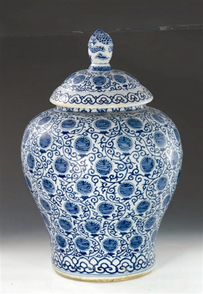 天津博物馆藏明万历款青花百寿文盖罐,通高63厘米、口径23.5厘米、底径27厘米。此罐直口,短颈丰肩,鼓腹下收,平砂底。其盖隆起,以青花绘莲托九个团寿字围绕着立龙钮。通体青花绘缠枝莲托团寿字,组成百寿文。盖沿和近足处饰如意云头纹,外底中心白釉下青花绘双圈 ,内书“大明万历年制”六字双行楷书款。