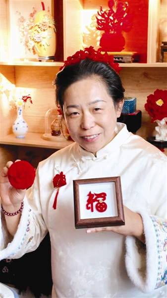 聂书娟表示:“中国结寓意是喜庆圆满,中间的‘春’字,代表春天来临、欣欣向荣,整幅作品展现了当下百姓丰衣足食的幸福生活。”