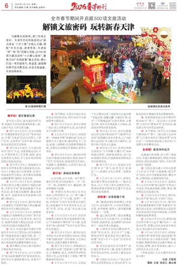 ■ 即日至2月23日,古文化街推出“非遗迎新春曲艺过大年”等系列活动,开展“玉皇会”民俗仪式展示、“津门百戏、古街贺岁”古街年集·纸韵迎春活动及民间花会展演。