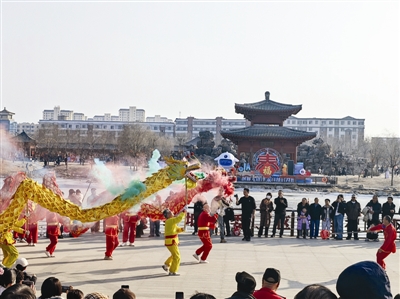 活动内容:在了凡公园西侧开元路段组织大鼓、舞龙舞狮、高跷、小车会等非遗花会展演,让游客在民俗表演中感受新春之喜。
