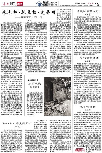 天津城垣上,同祀朱衣神的这座魁星楼,没有留下细节描述的文字。一幅于城外拍摄的照片,可见其为二层结构,十字脊四面歇山顶。照片所摄不是挂匾的楼门正面。历史上,同样也奉朱衣神,津西杨柳青镇东南隅,有座寄托着“文风丕振”乡愿的楼阁,六角三层,正楷书额“文昌阁”。