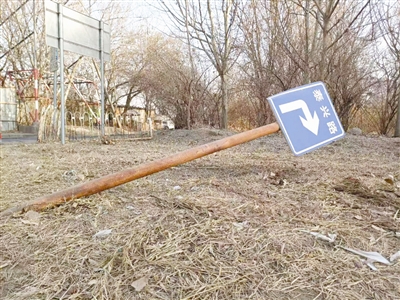 市民周先生反映,河北区民权门地铁站附近绿化带上,一简易路牌被撞后倾倒,望有关部门抓紧处置。