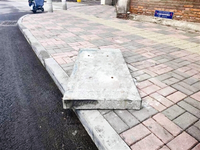 市民高先生反映,河西区新围堤道与重华大街交口附近人行道上,一块曾用于设置果皮箱基座的长方形石材出现移位,妨碍行人及车辆通行,希望相关部门尽快处理。