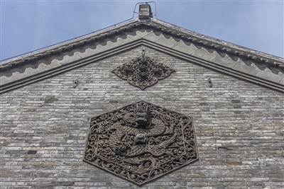 天津广东会馆的细部装饰,朴素中仍彰显着细节之美。例如屋脊上的装饰就没有南方广东会馆的装饰那么层次丰富和颜色绚烂。主要采用重点部位装饰的手法,以木雕和石雕为主。戏台处的木雕是整座会馆木雕装饰的精华,特别是伸出式舞台上方的鸡笼式藻井,将工匠高超的小木作技艺展现得淋漓尽致。除此以外,在广东会馆主体建筑的外檐及卷棚廊的各种木构梁架上,都有立体丰富的木雕装饰。