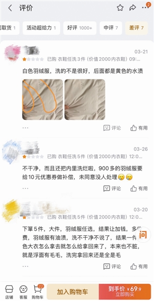 市民王女士告诉记者,之前为图方便,她在网上选购了一套69元洗5件的洗衣套餐,平台提供快递上门取件,整个过程十分省事。可等衣物洗完寄回后,王女士发现其中一件羽绒服的羽绒明显变薄,穿在身上也不如以前蓬松保暖。另外一件衣服领口处的污渍依旧明显,基本没有清洗干净,整体效果和送洗前相差不大。事后,她多次联系平台客服反映问题,但始终没有得到明确答复和处理,事情也就搁置下来。