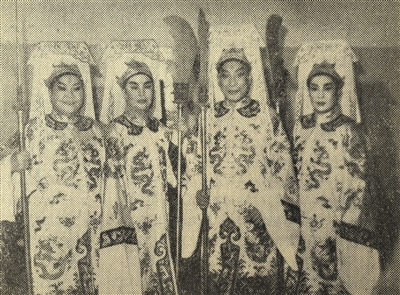 1984年10月21日天津市第一工人文化宫“爱我中华、修我长城”义演四龙套(从左至右):王则昭、筱少卿、厉慧良、裘爱花。