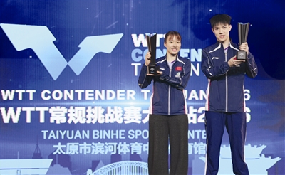昨天,WTT(世界乒乓球职业大联盟)太原挑战赛决出混双冠军,中国组合黄友政(图右)/石洵瑶以3比1(11比7、11比9、6比11、11比7)战胜中国香港组合黄镇廷/杜凯琹,夺得冠军。 新华社发