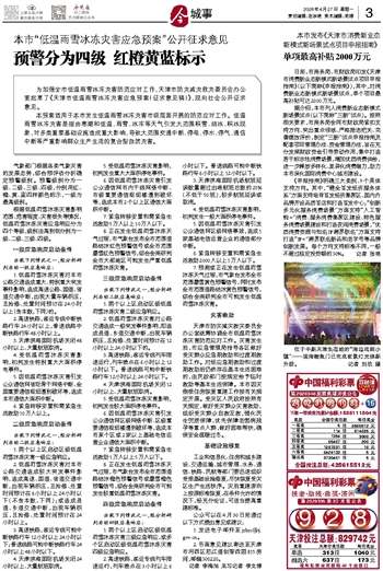 为加强全市低温雨雪冰冻灾害防范应对工作,天津市防灾减灾救灾委员会办公室起草了《天津市低温雨雪冰冻灾害应急预案(征求意见稿)》,现向社会公开征求意见。