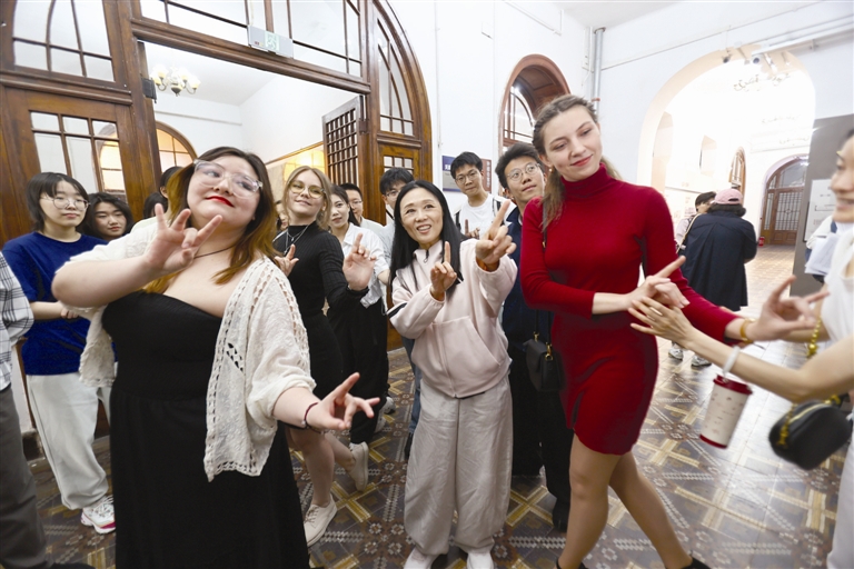教外国留学生比划兰花指、给京剧社的大学生说戏曲吐字的细节、向大家示范黄梅戏经典的唱段……活动正式开始之前,吴琼在报告厅外已经和大家热络地交流起来——