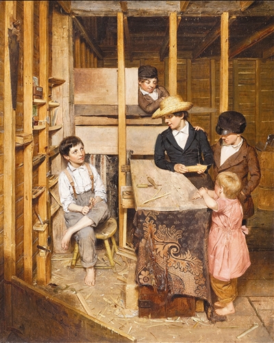 这幅名为《小机械师》的画完成于1848年,画面的主要场景是一家简陋的木匠店铺,地面上还有没来得及清扫的碎木屑和木片。粗糙的柜台后面,摆放着工具架,木匠常用的家什应有尽有。工具架下坐着一个身穿工装裤的赤脚小男孩,神情泰然自若,熟练地削着一根木棍,虽然年纪小,却已经在有模有样地招呼他的顾客了。靠在柜台上的顾客和他年纪相仿,头戴草帽,穿着套装,显得家境殷实,手里拿着一只玩具木船。结合小木工手里的动作来看,应该是玩具船需要换一根新桅杆。这位小主顾一副小大人模样,似乎正在讨价还价。旁边的两个小跟班煞有介事地打量着店铺,隐约间流露出一丝嘲弄的神情。在他们身边,一个穿着粉色衣服的小女孩正扶着柜台好奇地张望,她同样光着脚,可能是木工男孩的妹妹。画里的场景虽然宁静,却也隐约显示出不同社会阶层之间存在的张力。在史密斯作画的年代,正值美国北方的经济转型阶段,手工业者提升技能的渴望日益显著。不难看出,史密斯的笔下对劳动者的未来寄予了希望。