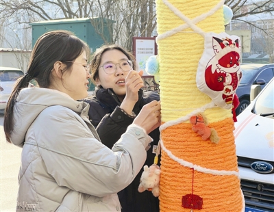 现场,青春的身影正在忙碌。河北工业大学的学子们围在树旁缠绕固定,低声商量着配色。“我们特意以红、黄、橙为主色调,融入‘洪小狸’和传统年味元素,想让大家一看就感到喜庆和温暖。”正在固定编织作品的夏佚男同学介绍。他负责的树干上,灵动的蝴蝶、可爱的小马与鲜艳的色彩交织,仿佛在树皮上讲述着温暖的童话。