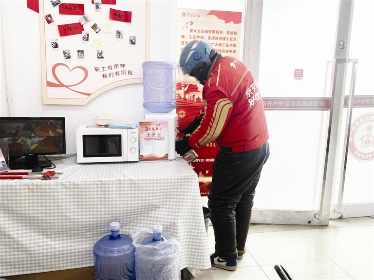 前天中午11时30分,记者来到时代奥城工会驿站,这个面积不大的空间里,冰箱、饮水机、应急药箱、充电器和工具箱等物品有序摆放,为过往户外劳动者提供便利。