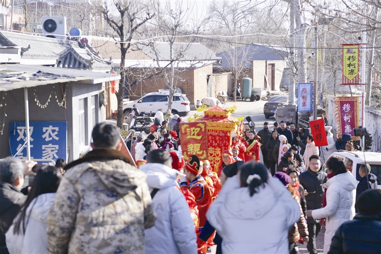 巡游至实景舞台,“穆桂英”身着红装、头蒙盖头,在“杨宗保”的牵引下跨火盆、过马鞍,完成一拜天地、二拜高堂、夫妻对拜的传统礼仪。“一拜天,风调雨顺护家园;二拜地,五谷丰登随民意……”傧相的吆喝声朗朗上口,“穆瓜”的趣味互动穿插其间,侍从们向人群抛撒喜糖,甜香与欢笑交织,让整个古村都沉浸在团圆的喜悦中。
