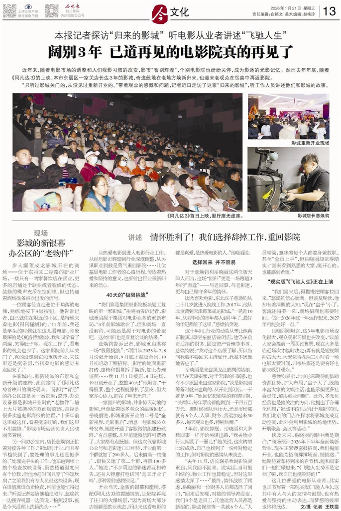 当电影投资的热钱“冷却”,电影市场回归理性;当人们的观影习惯逐渐改变,甚至不再是日常休闲的刚需,电影业当如何自处?电影院该何以为继?上个月,本市东丽区一家关停3年之久的影城成为行业的“逆行者”,在众多影迷的期待中重新开张,也点燃了影城十余年前开业时的初心——用好电影把观众拉回影院。