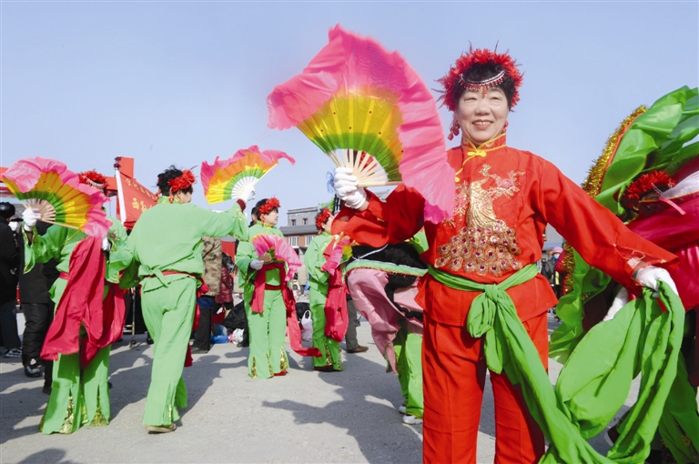 9:30左右,车即将到站,窗外逐渐热闹起来,车刚停稳,人们便迫不及待下车奔向大集。穿过写有“芦台大集”字样的大牌子,两侧是望不到头的摊位,耳边传来锣鼓声、叫卖声、谈笑声……目光所及,是一片红色的海洋。每一条街巷上空,中国结与红灯笼连成一片。商户们清一色系着红围裙,招牌上也点缀着红色,这统一的“新年装束”,让一眼望不到头的摊位浑然一体,年味儿十足。