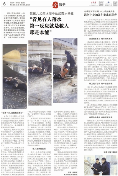 刘玉坤说:“我不会水,当时看到冰上的情况就在脑子里快速回忆以前了解过的知识,并在附近找了一根长木棍递过去,帮助他们上岸。”