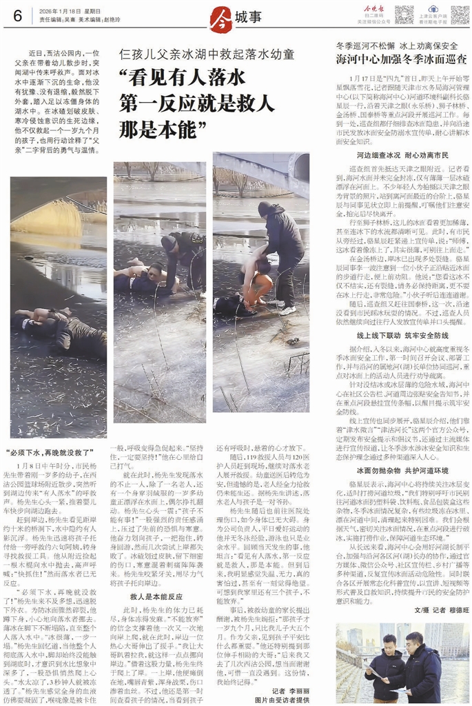 2026年1月8日中午12时左右,杨先生带孩子在西沽公园游玩,听闻有人落水,近前查看发现有人落入公园水潭冰面下的水中,现场情况十分危急,杨先生毅然决定下水施救,营救过程中,他趴在冰面上一直尝试将落水者推上冰面,其本人因营救身上发生多处擦伤,仍克服困难一直在水中坚持,但因体力不支且冰面十分脆弱一直没有营救成功,后又有一位热心群众刘玉坤见此情况趴在冰面上小心靠近二人,最终将杨先生和落水孩子慢慢拽了上来。