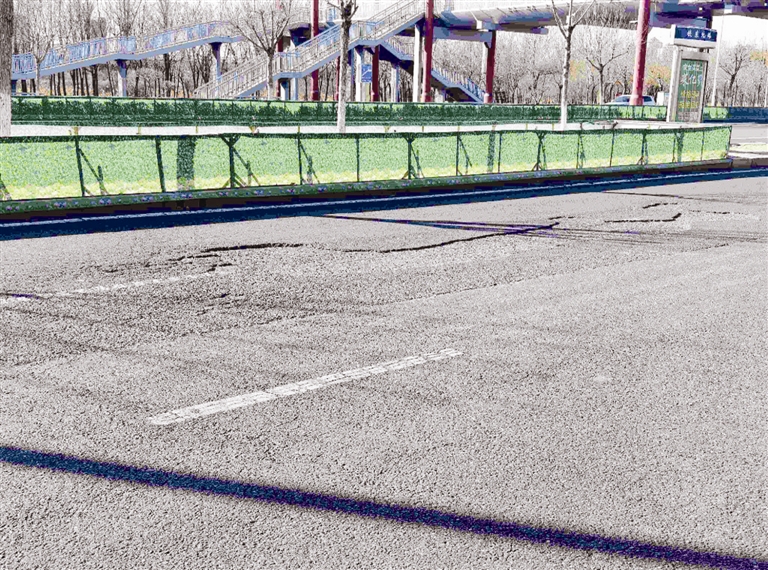 1月23日,记者来到北辰区铁东北路辅路,从洛河西道天桥开始,记者驱车一路向北行驶,每隔大约50米,道路就会有一个大坑,一直行至铁东北路与龙门东道交口处,几百米的道路上出现五六个大坑,大坑的面积几乎占据整条车道。这段辅路是单向三车道,最严重的路段坑就占据两条车道。其中大部分坑洼都有沥青修补过的痕迹,颜色比旁边道路要深,但是长期碾轧后,坑洼又出现了。记者在此处半个小时内发现,很多车辆经过这些坑都出现急刹车缓速通过。遇到躲避或减速不及时,车辆经过大坑就会发出“咣当”的声响。“路况太不好了,到了晚上视线不好,更是容易被‘坑’。”一位司机说。