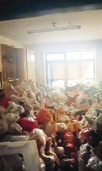 当房门被打开的瞬间,一股难闻的气味扑面而来,眼前的景象更是让众人瞠目结舌——屋内堆满各类垃圾,从地面到墙角几乎无处落脚,彩色塑料袋、外卖餐盒、各类生活垃圾杂乱堆叠,场面混乱不堪。