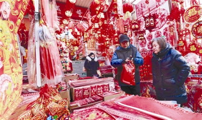 天津的吊钱儿最具地方风情,用鲜艳的红棉纸刻成,临近除夕,大街小巷随处可见售卖的摊贩。有的人家还会用芝麻秸粘上金纸叠成的“元宝”,捆扎成“聚宝盆”的形状,放在院中,待除夕夜踩踏,谓之“踩岁(碎)”,借“芝麻开花节节高”的吉言,期盼家业兴旺。关于吊钱儿,旧时还有一套细致的讲究:需等到正月二十四晚上才将其撕下,包上少许铜钱,举行一个象征性的“存入粮囤”的仪式,以祈祷来年丰衣足食。