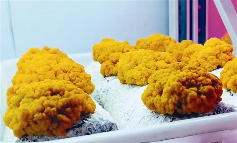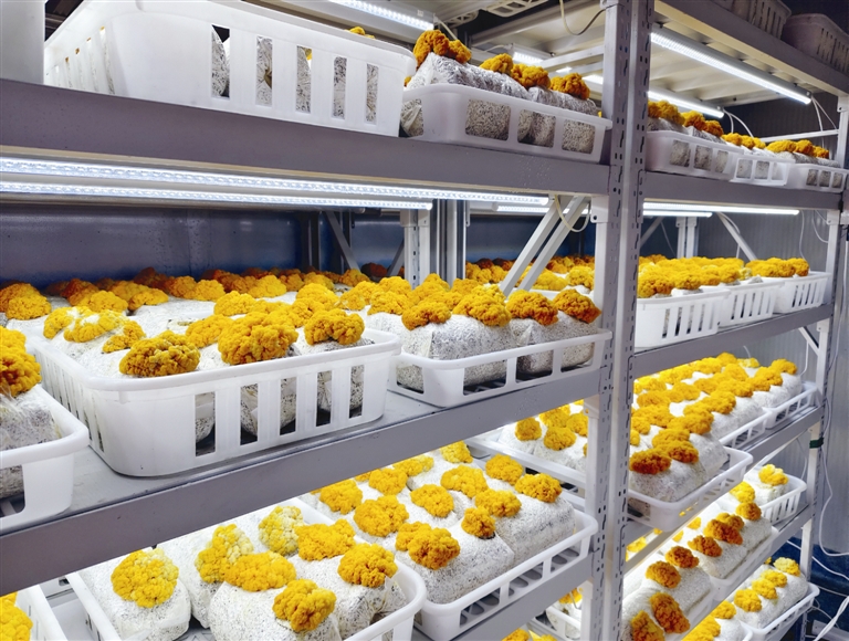 智能蘑菇方舱堪称金耳生长的“理想家园”,因其一体化设计,无需单独批地,利用闲置场地即可搭建;通过5G+智能控制系统,可实时监测并自动调节温度、湿度、光照、二氧化碳浓度等参数,实现全年恒温恒湿,让舱内“只有春季没有四季”;同时支持远程操控和无人化作业,大幅降低人力成本,单舱可放置4500个菌棒,一年可种植12茬,单舱年收益超15万元;废弃菌包还可转化为土壤改良剂,实现生态循环利用。陈国华介绍,金耳因其外观色泽金黄而得名,含有丰富的蛋白质、氨基酸和微量元素等,具有滑、嫩、弹的独特口感。山姆、盒马、小象等大型超市均有售卖,单朵重量约为150至200克,价格多为15元左右,可通过凉拌、炒制、炖汤、煮粥等多种方式食用。