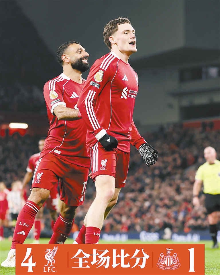 本报讯(记者 王梓)苦等1个月,利物浦队终于迎来了2026年的英超首胜。北京时间昨天凌晨,他们在主场4比1大胜纽卡斯尔联队,本赛季第二次在英超赛场至少攻入4球,而他们上一次在联赛中净胜纽卡斯尔联队至少3球,还要追溯至2018—2019赛季。