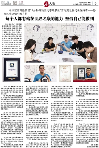 答:目前其实我已经准备好要刷新一些其他的纪录了,目前预计在今年的5月,回到我的家乡,静海区独流镇。我和大家一样,都是普通人,每个人都有站在世界之巅的能力,要坚定的相信自己能做到!