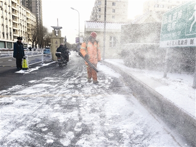 即使降雪还在继续,清扫也如期展开。为什么不等降雪结束再清扫呢?“雪积太厚也不利于清扫,随下随扫,后期再清也省力。”张雷解释,在与环卫工人对接重点清扫地点的同时,他也向上级汇报道路积雪情况。最后他决定返回队里取吹雪机,“今天早晨乘车的人多,人行道得保障好。”