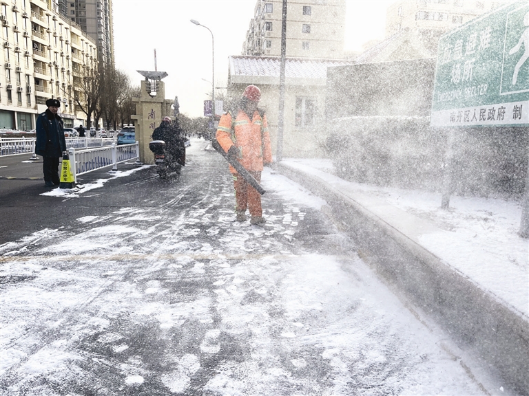 昨天凌晨,一场降雪悄无声息降落津城。很多人直到清晨走出家门,才发现积雪的地面和仍在飘落的雪花。伴随着上班族的脚步,机动车道上的落雪很快没了痕迹,人行道上的积雪也被环卫工们快速清理。在今年的清雪过程中,“吹雪机”的出现,让人们看到了清雪工具的变化,升级换代的不仅仅是一件工具,这种新型物理清雪方式,对环境整洁也更加友好。