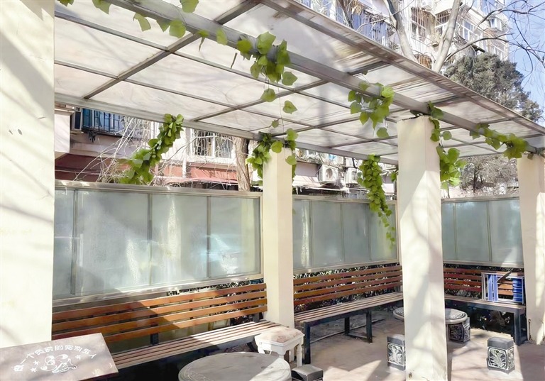 这方焕新的休闲角落,是红桥区西沽街道青春里社区联合准物业公司精心修缮的成果。工作人员对破损的顶棚进行了修补加固,修复了摇晃的座椅,还给每张桌椅都做了打胶固定处理,让原本陈旧的长亭重焕生机。