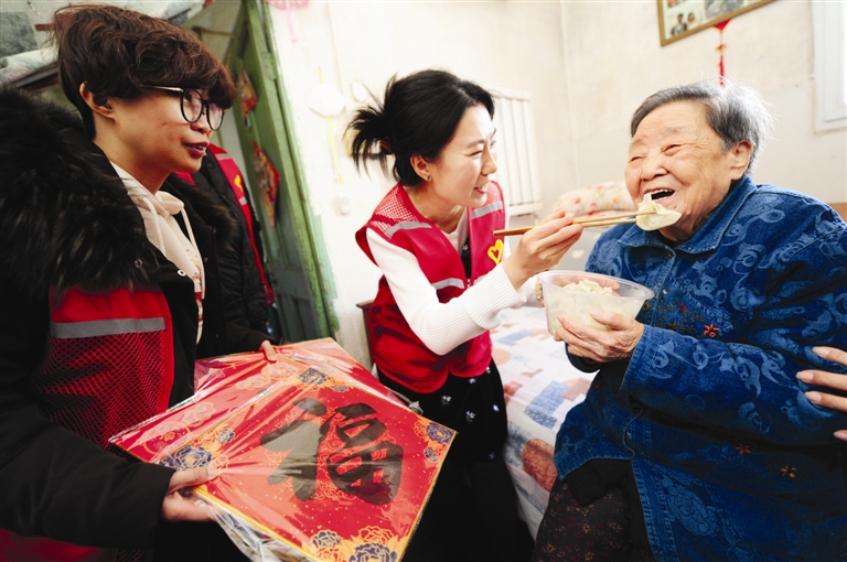 “王奶奶,快到小年啦,您趁热吃个饺子吧,这是我们自己包的。”几名社区志愿者把刚出锅的饺子送到社区老人王惠珍家。